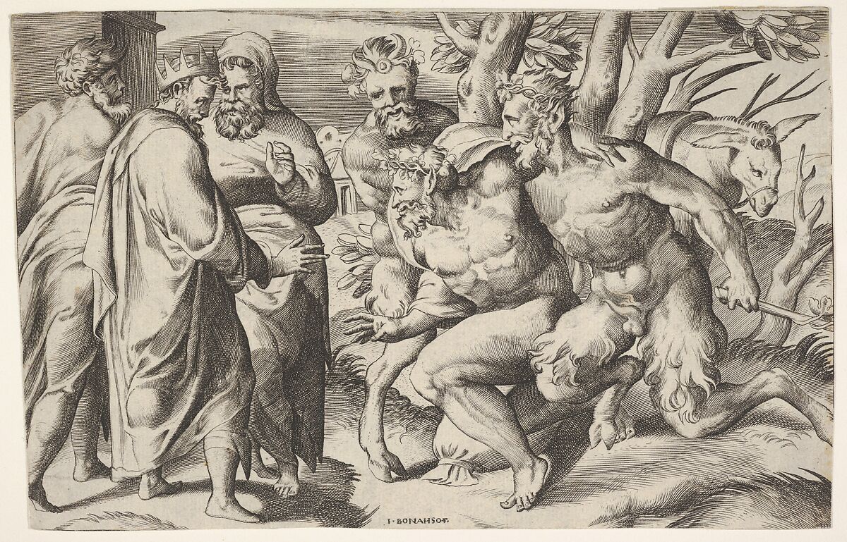 - Title: Two satyrs leading Silenus to King Midas, who stands at left with two male attendants, a mule trails behind the satyrs