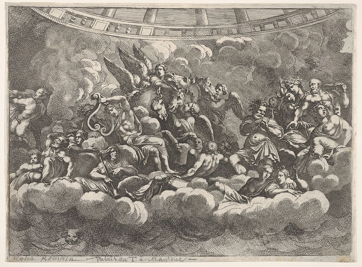 Gathering of various Olympian gods and mythological figures among clouds, Apollo at center with his lyre, Vulcan, Mercury, Hercules, and Hermes to right, various figures below, horses and attendants behind in center, from "Giove che fulmina li giganti", after the frescoes on the ceiling of the Sala dei Giganti designed by Giulio Romano for the Palazzo del Te, Mantua