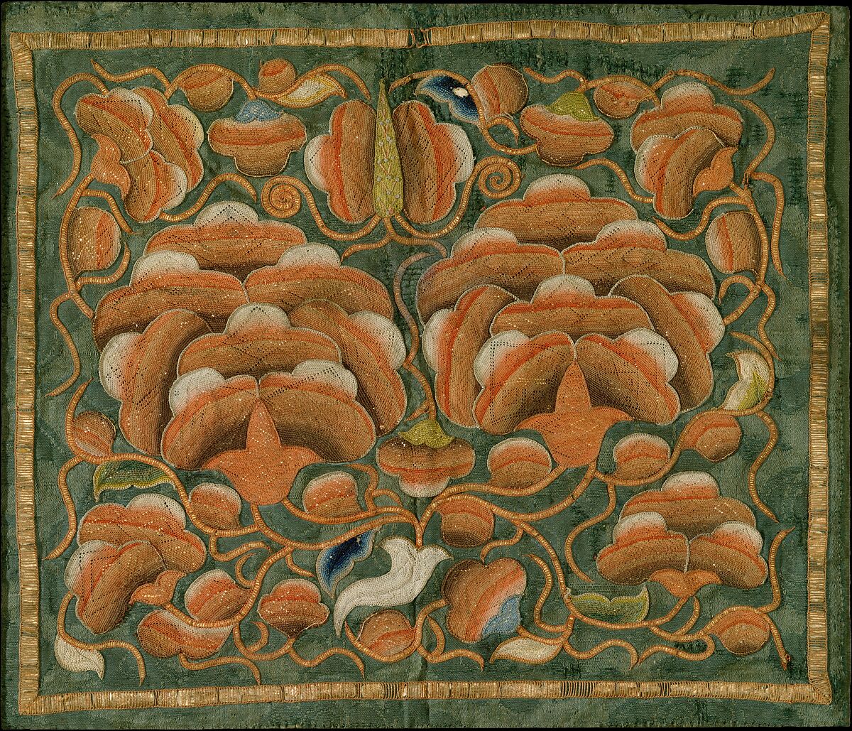 - Medium: Silk needle-loop embroidery over gilt metal strips on silk satin damask