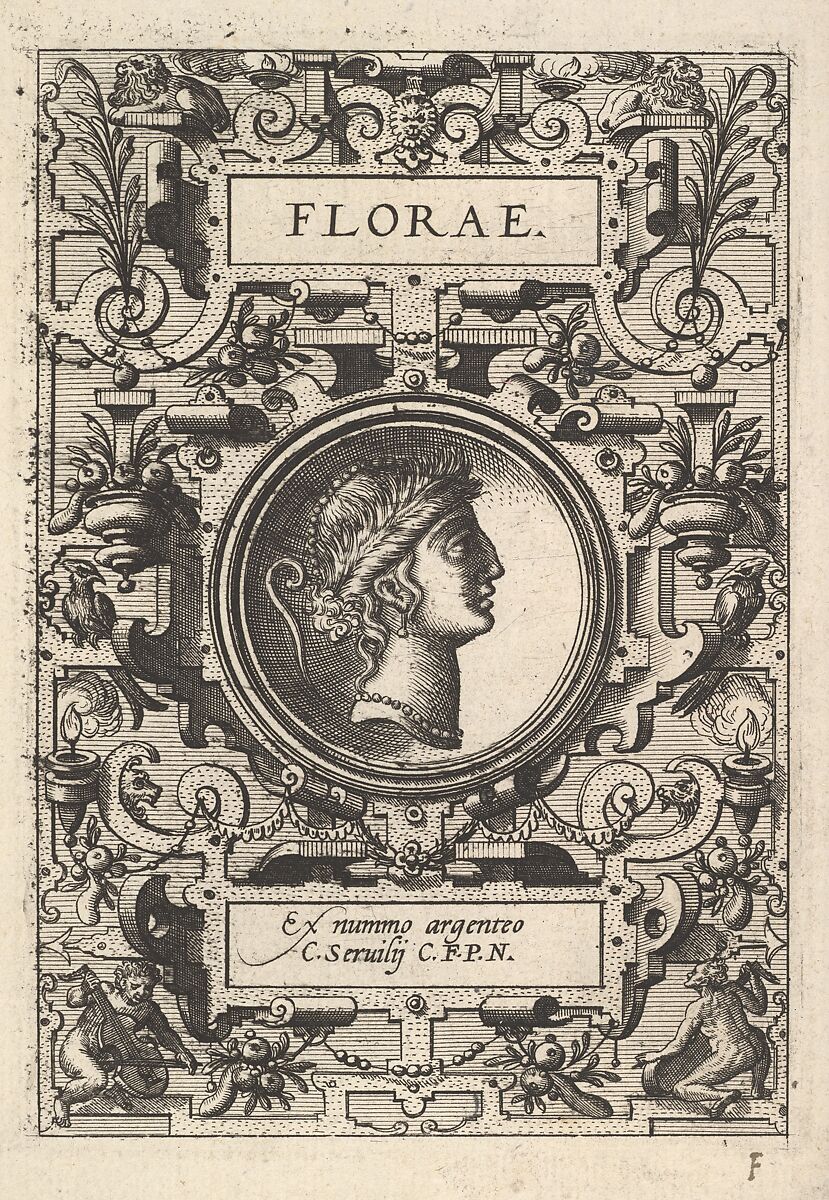 - Title: Bust of Florae surrounded by strapwork, from "Deorum dearumque"