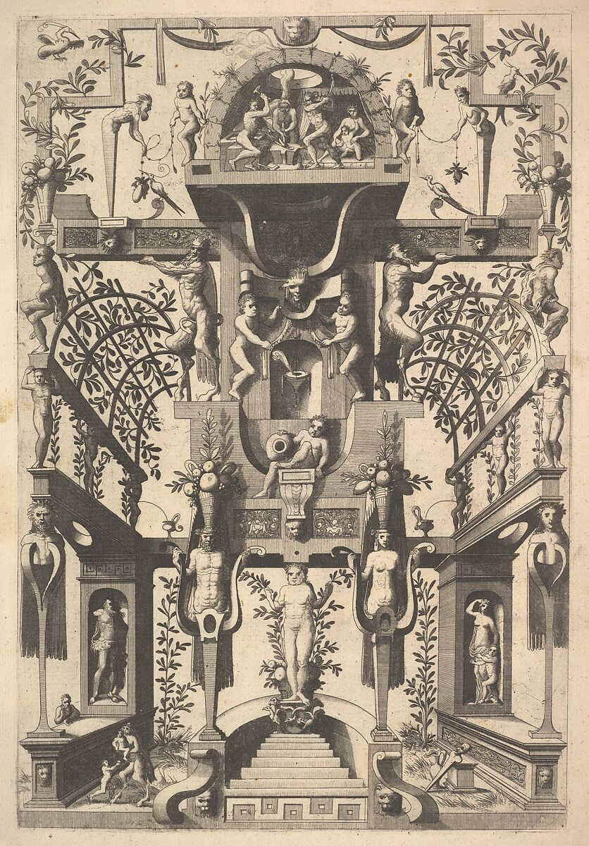 - Title: Fantastic Architecture Structure with Strapwork and Two Pergolas and a Small Scene with Vulcan's Forge at the Top