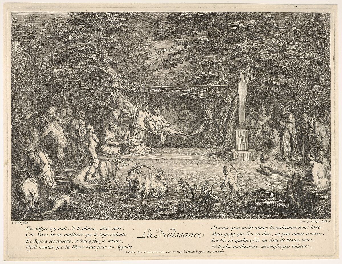 - Title: The Birth (La Naissance): in a forest, the new mother resting in a hammock at center, the newborn below her to left, various satyrs and goats surrounding, from "The lives of satyrs" (La vie des satyres)