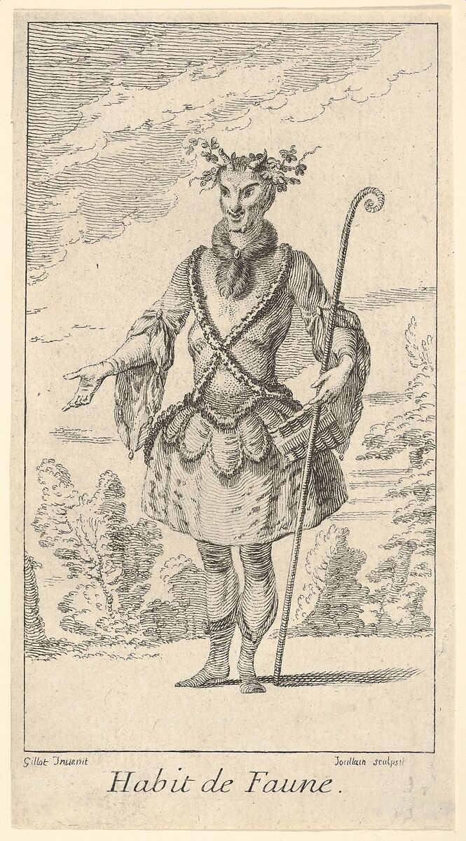- Title: Habit de Faune: a faun wearing a tonnelet with a flute attached, a cane in his right hand and vines around his horns, from "New designs for costumes" (Nouveaux desseins d'habillements à l'usage des balets operas et comedies)