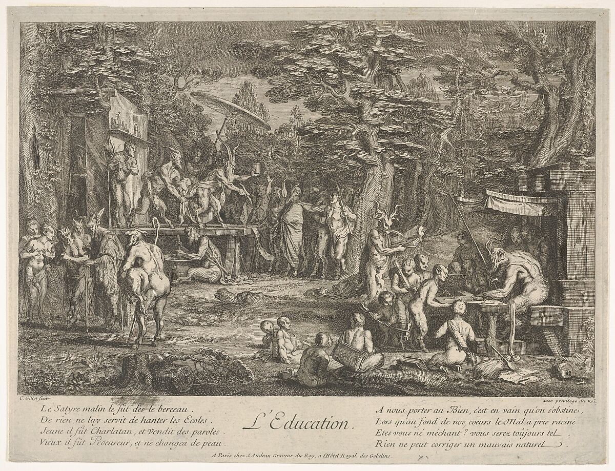 - Title: The Education (L'Education): in a forest, to right an old satyr instructor holding a wand, teaching a group of children, to the left a merchant of orvietan trying to attract spectators with his act, from "The lives of satyrs" (La vie des satyres)