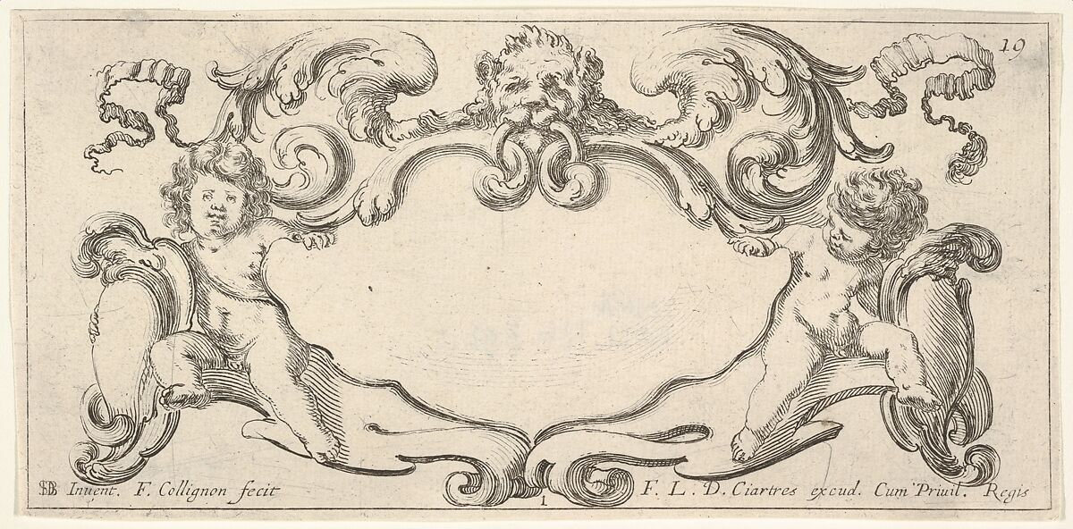 - Title: Plate 1: a cartouche with a lion head with wings at top center, a putto holding a blank escutcheon to either side, from "Twelve cartouches" (Recueil de douze cartouches)