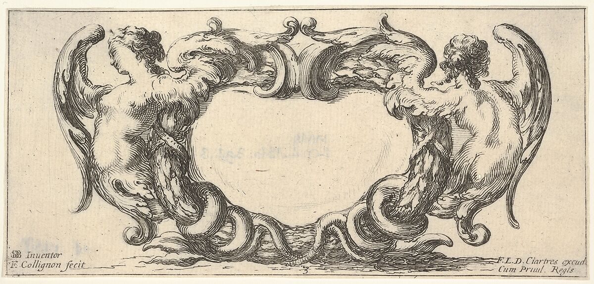 - Title: Plate 3: a cartouche with a woman with wings ending in a serpent's tail to left, seen from the front, a similar woman seen from the back to right, from "Twelve cartouches" (Recueil de douze cartouches)