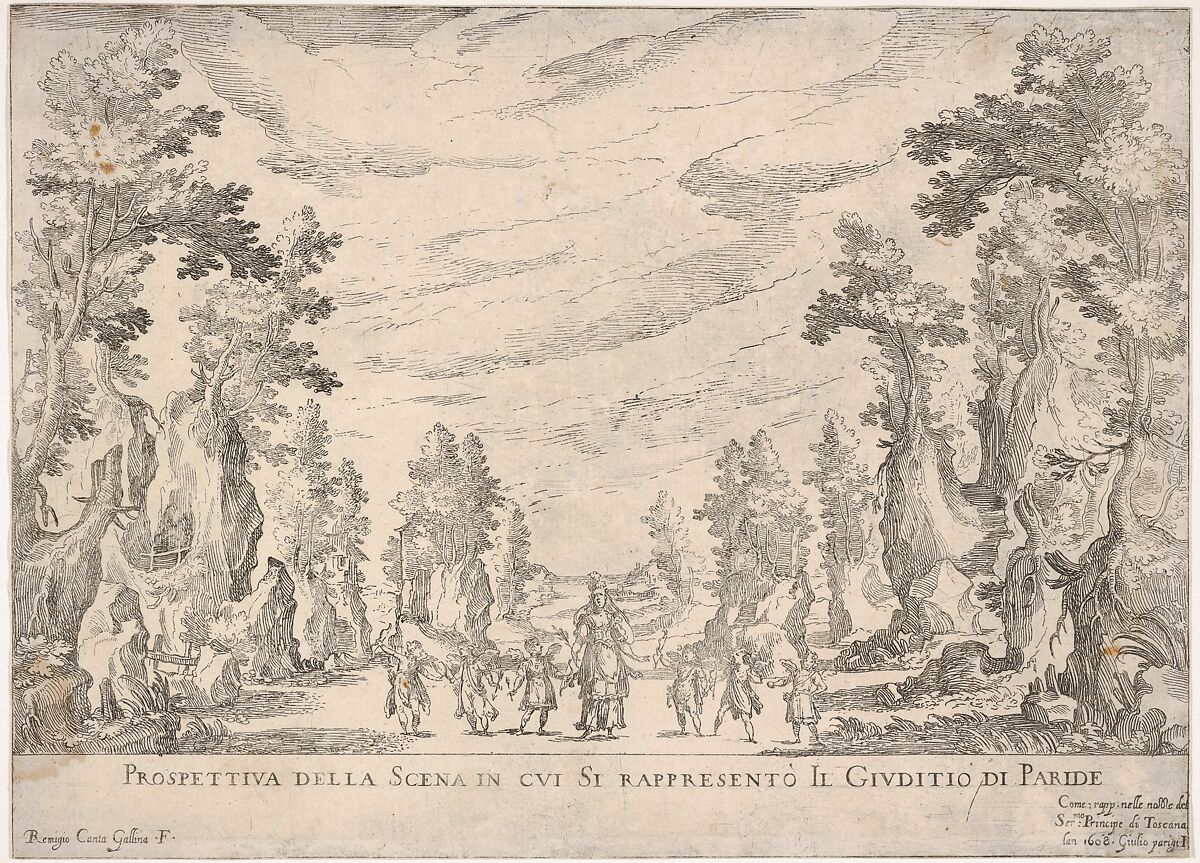 - Title: View of the scene in which is represented the Judgment of Paris (Prospettiva della scena in cui si rappresentò il Giuditio do Paride), from "Seven Interludes for the wedding celebration of Cosimo de' Medici in Florence, 1608"