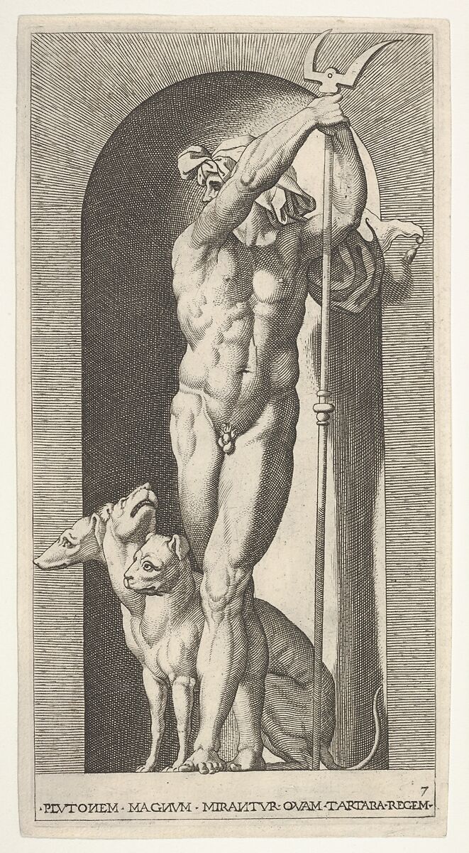 - Title: Plate 7: Pluto in a niche, holding a bident, with Cerberus next to him, from a series of mythological gods and goddesses