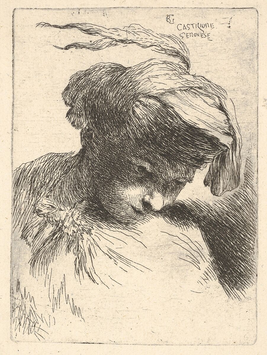 Young man looking down to right, from "'Small Heads in Oriental Headdress"