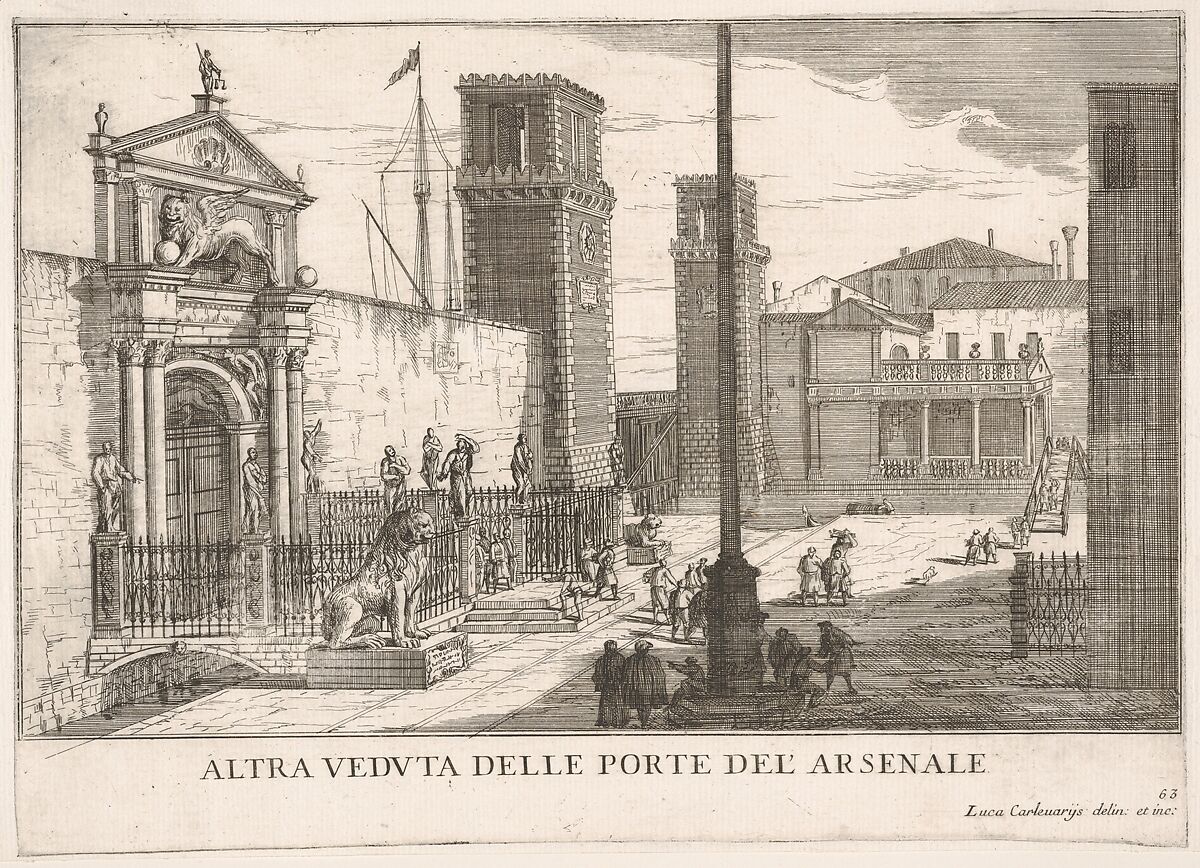 - Title: Plate 63: View of the gate of the shipyard and armory complex (Arsenale), Venice, 1703, from "The buildings and views of Venice" (Le fabriche e vedute di Venezia)