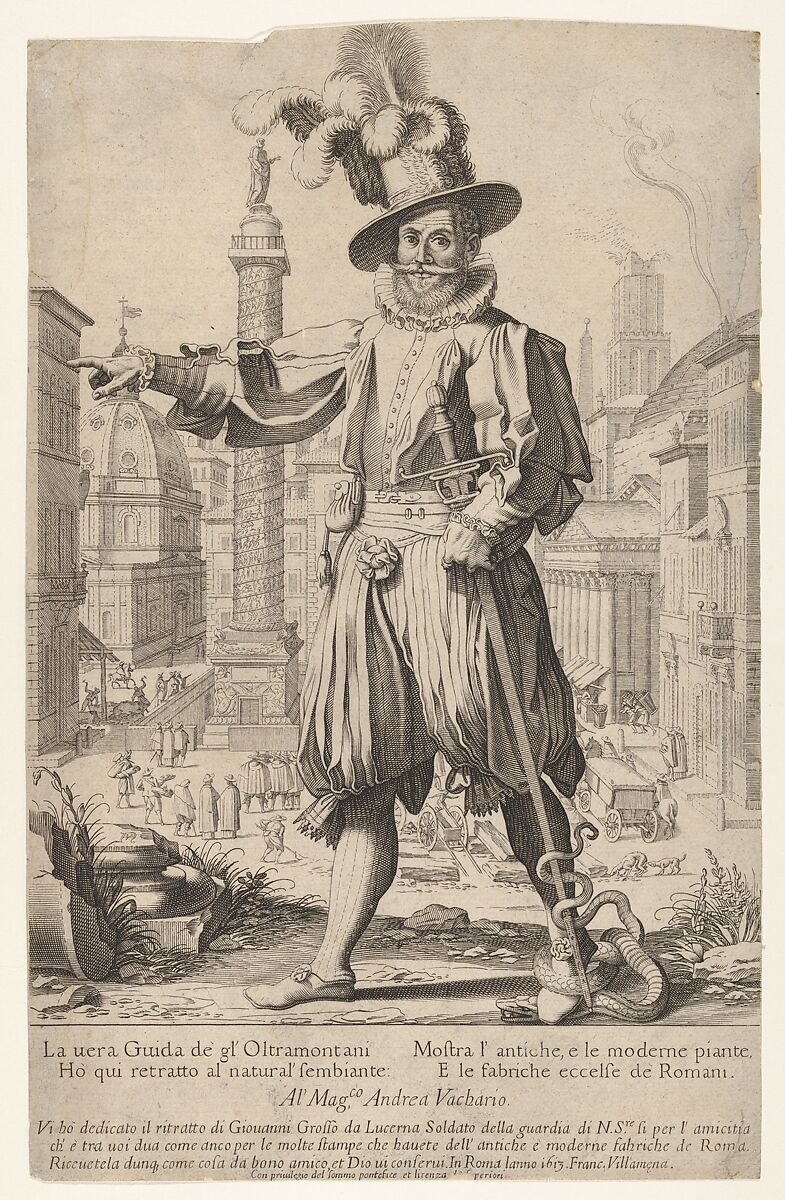 - Title: Giovanni Grosso standing on the Quirinal Hill in Rome, with his right arm outstretched and a snake coiled around his foot and sword
