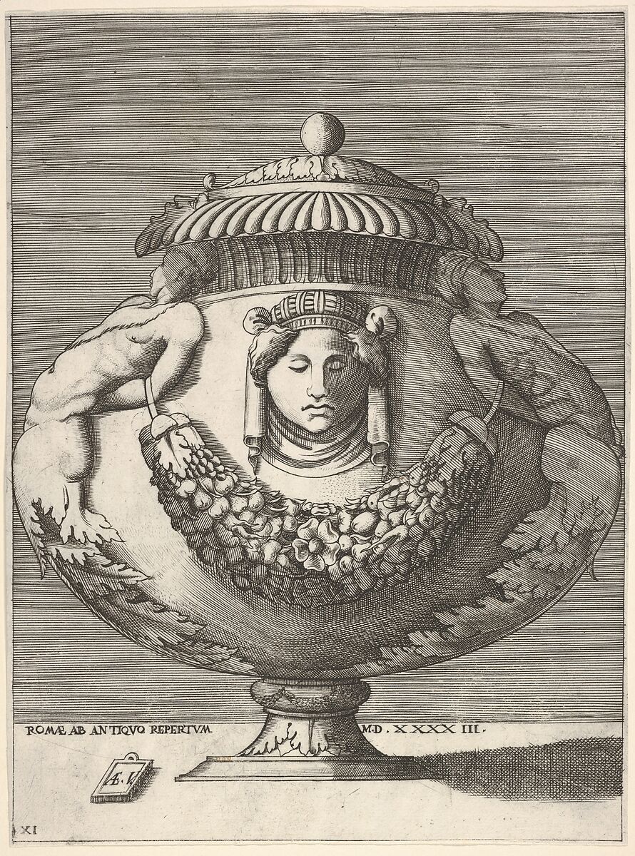 Antique lidded urn with hybrid male sphinxes on either side of the body of the vessel, supporting the lid. Suspended between them is a richly filled garland of fruits and flowers. Above the garland a mask in the shape of a female head with a turban is depicted. From a series of vase designs after the Antique, first published by Enea Vico in 1543, and later included in a composite series with other designs by Agostino Veneziano by Antonio Lafreri dated circa 1573 based on its presence in Lafreri’s catalogue.