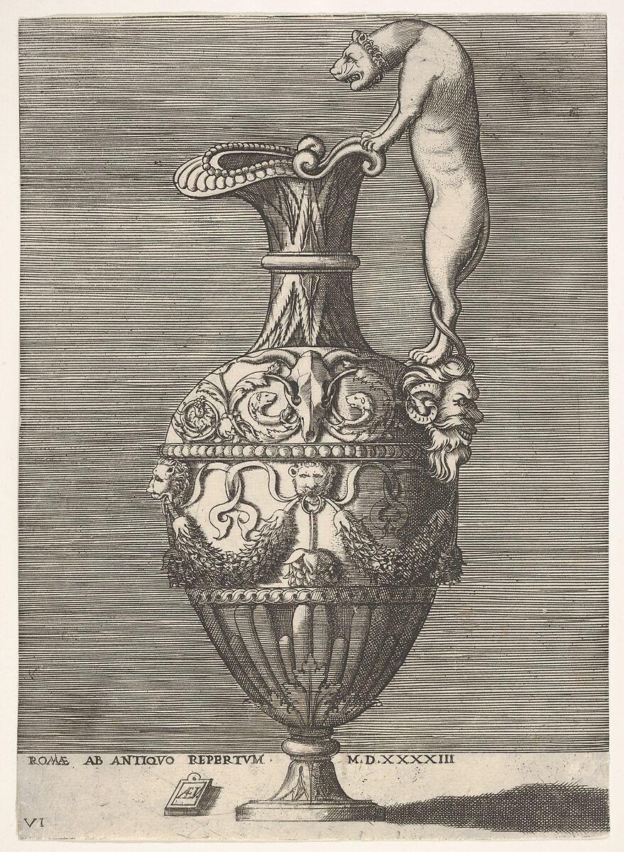 Antique ewer with a handle in the shape of a lioness. The ewer is further covered with various antique motifs including a bovine skull and garlands suspended from lion-shaped masks. From a composite series published by Antonio Lafreri with vase designs after the antique by Enea Vico and Agostino Veneziano. The Vico prints were first published by the artist in 1543, the Lafreri edition is dated circa 1573 based on its presence in Lafreri's catalogue, but may have been issued earlier.