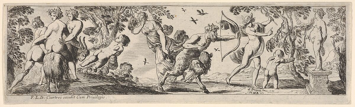 - Title: Composition of figures arranged in a landscape foreground before a statue of a female goddess, at left two nude figures support a nude woman riding a goat led by a putto, at center a draped woman holds one finger to her eye behind a satyr holding a bow, at right Mercury twists away from the satyr, from a series of twelve frieze-like designs showing bacchanals, sacrifices, and dances