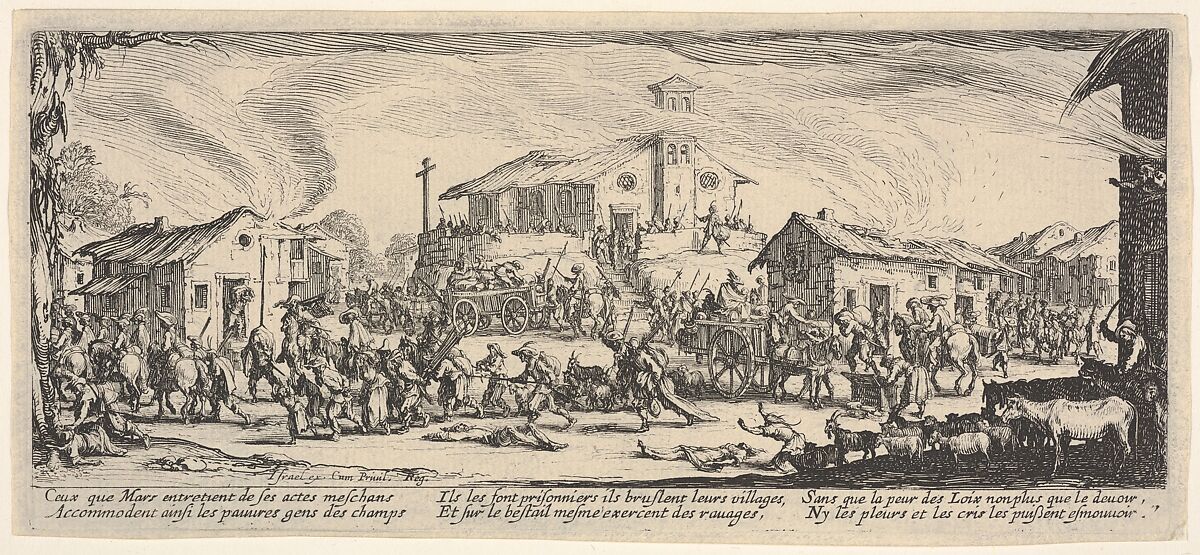 - Title: Plate 7: A town being sacked with church in the background, from "The Large Miseries of War" (Les misères et les malheurs de la guerre)