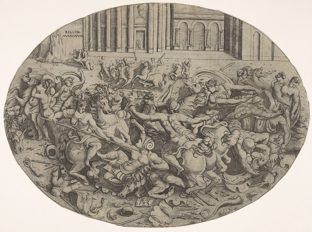 - Title: Combat between Amazons and men in front of architectural arcades, an oval composition with weapons, headgear, and bodies strewn along the bottom margin