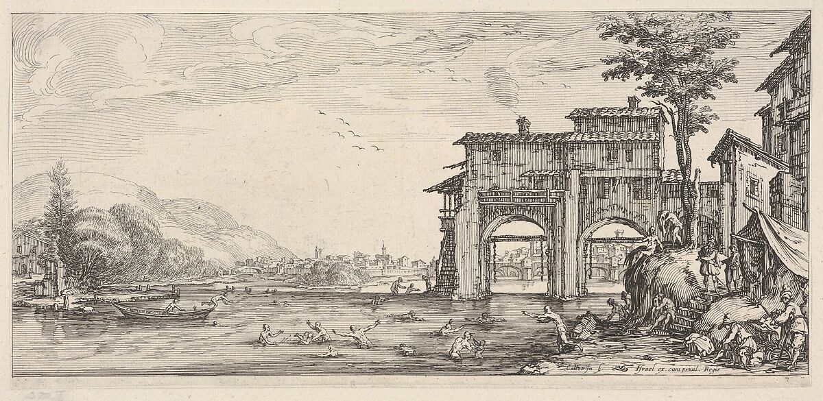 View of bathers and a large building at the right, from "Italian landscapes" (Diverse vedute designate in Fiorenza / Paysages italiens)