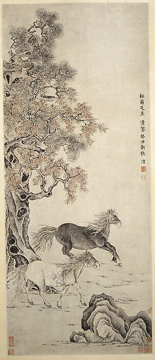 Executed at the height of the artist's career, Two Horses is a study in complements: dark and light horses; earthen shoreline and rocky outcrop; and contrasting species of trees. Charged with distinguishing between truth and falsehood, good and evil, Qian's imagery seems to reflect the powerful contending forces with which he had to deal during his precariously balanced career. His distinctive use of shading to model forms reveals the growing impact of European engravings and painting techniques on Chinese artists of this period.