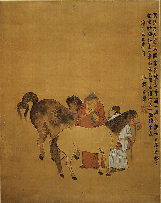 In this powerfully eccentric painting, Jin's intentionally awkward and self-consciously archaic revival of a composition and theme associated with Zhao Mengfu (1254–1322), a Chinese scholar whose service under the Mongols led to a number of positive reforms, makes clear Jin's aspiration to perform a similar function under the Manchu Qing dynasty. Inscribed with a poem that bemoans the absence of a worthy judge of horses, the painting is a thinly veiled lament that expresses the artist's feelings of being misunderstood and unappreciated: