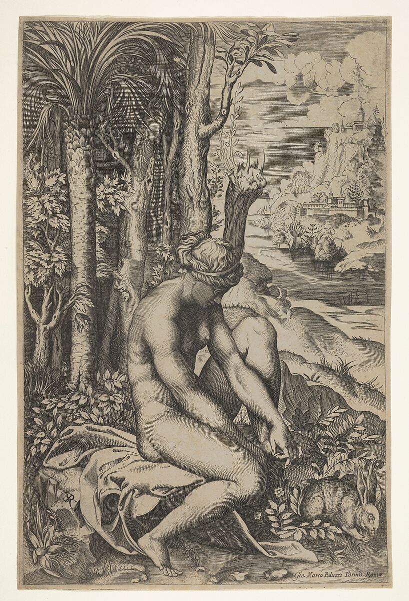- Title: Venus removing a thorn from her left foot while seated on a cloth beside trees and foliage, a hare eating grass before her