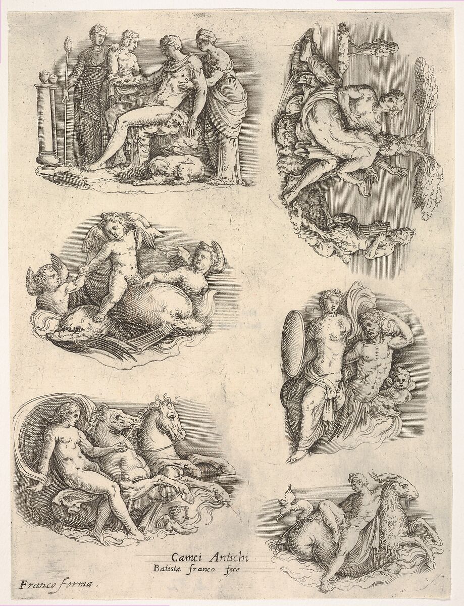 - Title: Six subjects after antique cameos: female figures tending to a seated male figure; putti and dolphins; female figure holding the reins of a pair of rearing horses; intertwined naked figures flanked by music-playing satyrs; triton with shield-bearing female figure; naked male figure seated on goat-headed sea creature