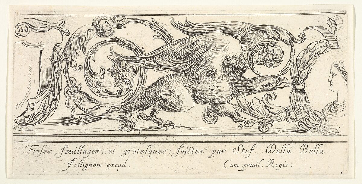 - Title: An eagle walking towards the right, a bust of a woman to right turned in profile towards the left, plate 1 from "Friezes, foliage, and grotesques" (Frises, feuillages et grotesques)