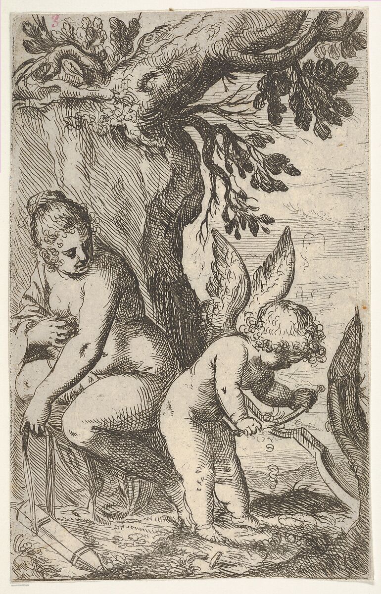 - Title: Cupid carves a wooden bow with a file, with his back turned toward Venus, from "Sport of Love" (Scherzi d'amore)