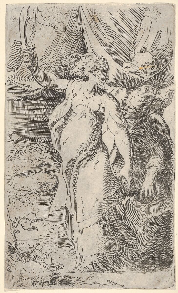 - Title: Judith with the head of Holofernes, which she places into a sack held by the figure behind her, she bears a sword in her outstretched right arm