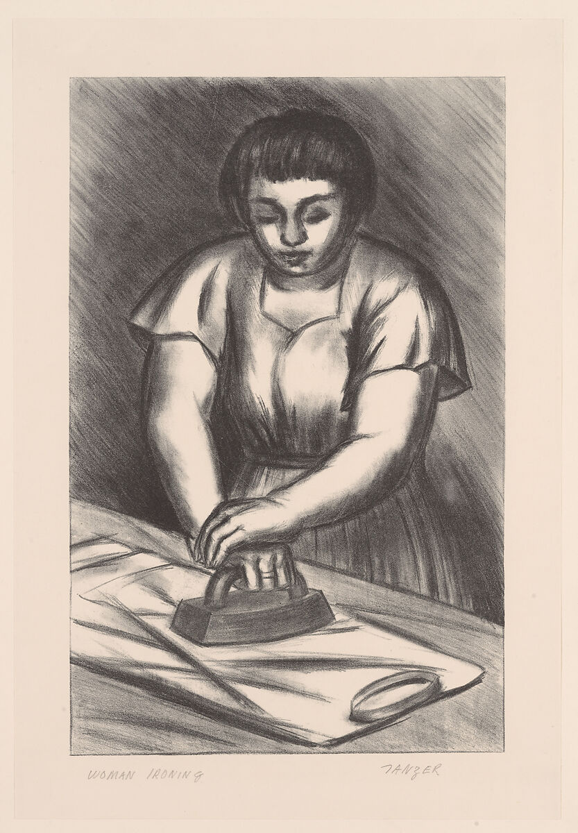 This luminous image of a woman ironing is one of tens of thousands of prints published in the 1930s and 1940s by the Works Progress Administration (WPA, also called the Work Projects Administration), an agency operated by the United States government to provide widespread work relief during the Great Depression. Like many other artists employed by the WPA’s Federal Art Project, New York printmaker Tanzer produced images that depict Americans at work—both inside and outside of the home. Whether the woman portrayed here is taking care of her own household or that of an employer, her quiet concentration on her task reflects the print’s immediate context as well as the longer visual tradition around women engaged in domestic work.