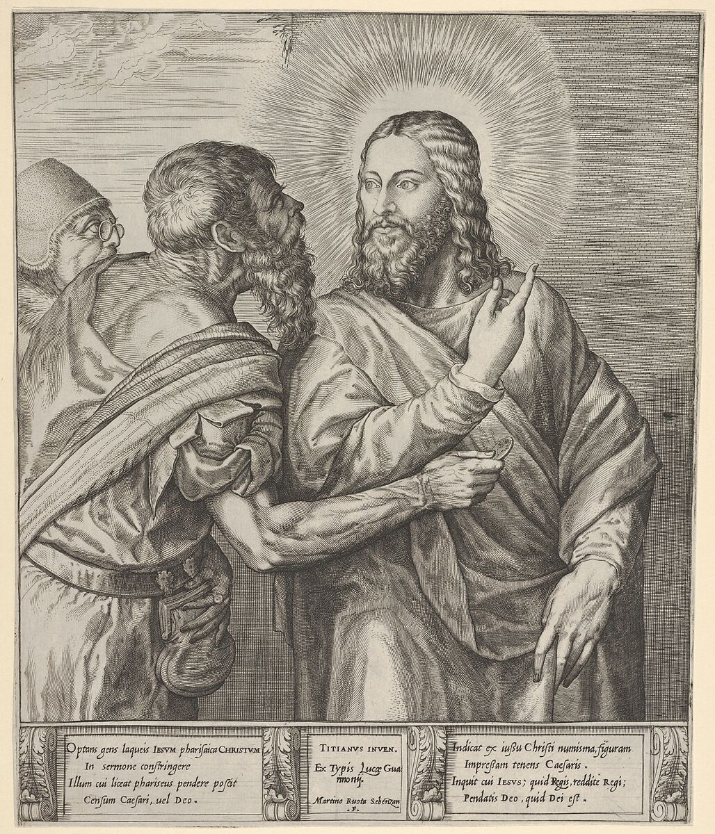 - Title: The Tribute Money: two Pharisees, one holding out a coin in his right hand, approach Christ from the left