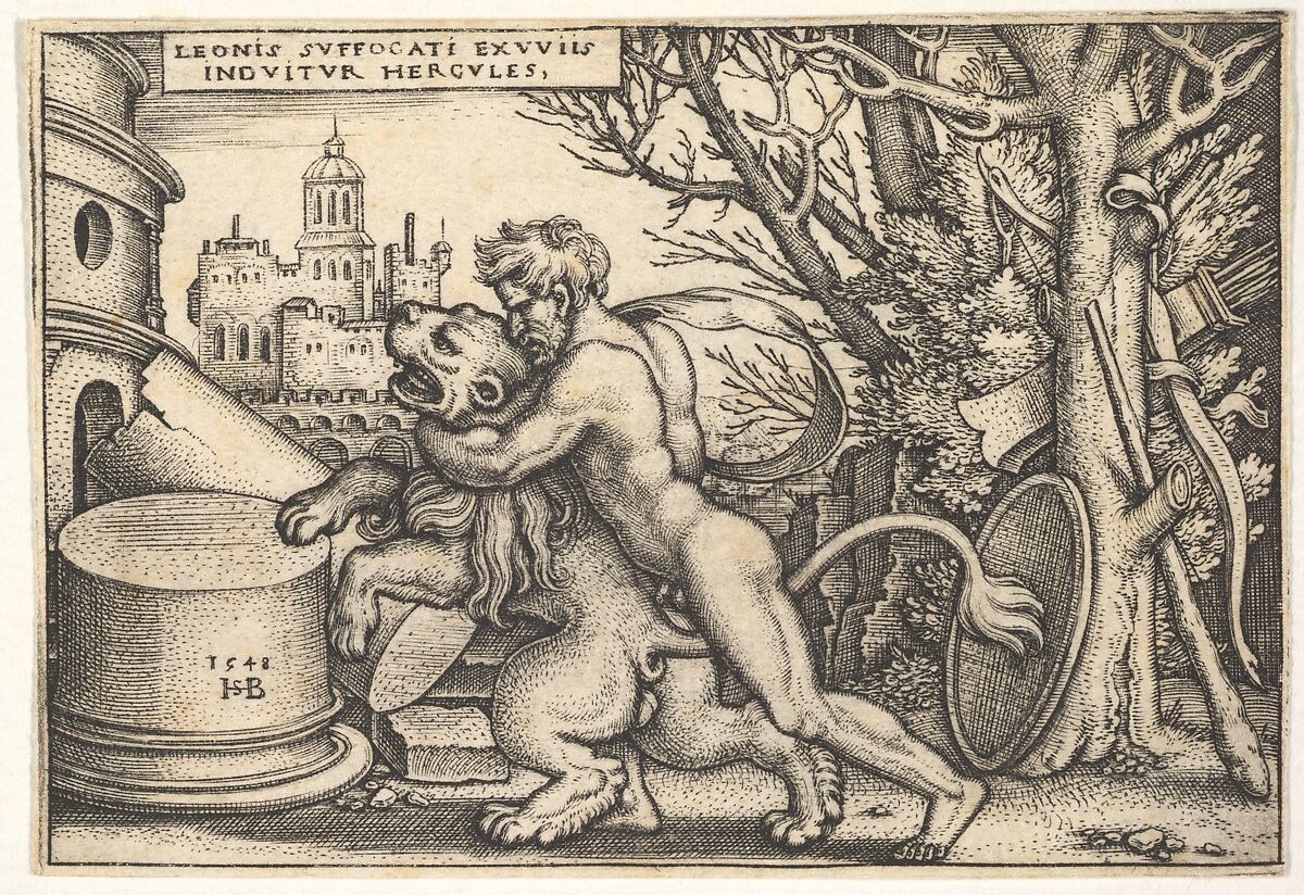 - Title: Hercules, in profile, killing the Nemean lion with his arm around its neck, from "The Labors of Hercules"