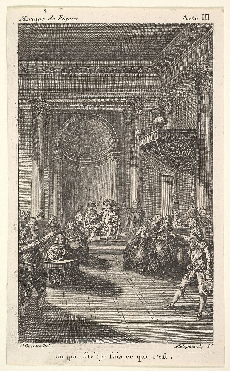 - Series/Portfolio: Five illustrations after Jacques Philippe Joseph de Saint-Quentin for 'The mad day, or the marriage of Figaro' (La Folle journée, ou le mariage de Figaro) by Pierre Augustin Caron de Beaumarchais