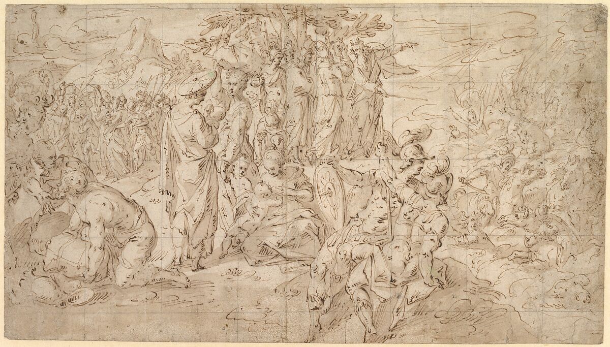 - Medium: Pen and brown ink, brown wash, over black chalk, squared in black chalk for transfer