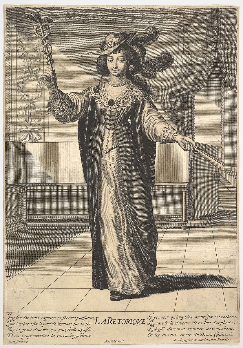 - Title: Rhetoric: a young woman standing in a decorated interior with a caduceus in her right hand and a closed fan in her left hand, from "The liberal arts" (Les arts liberaux)