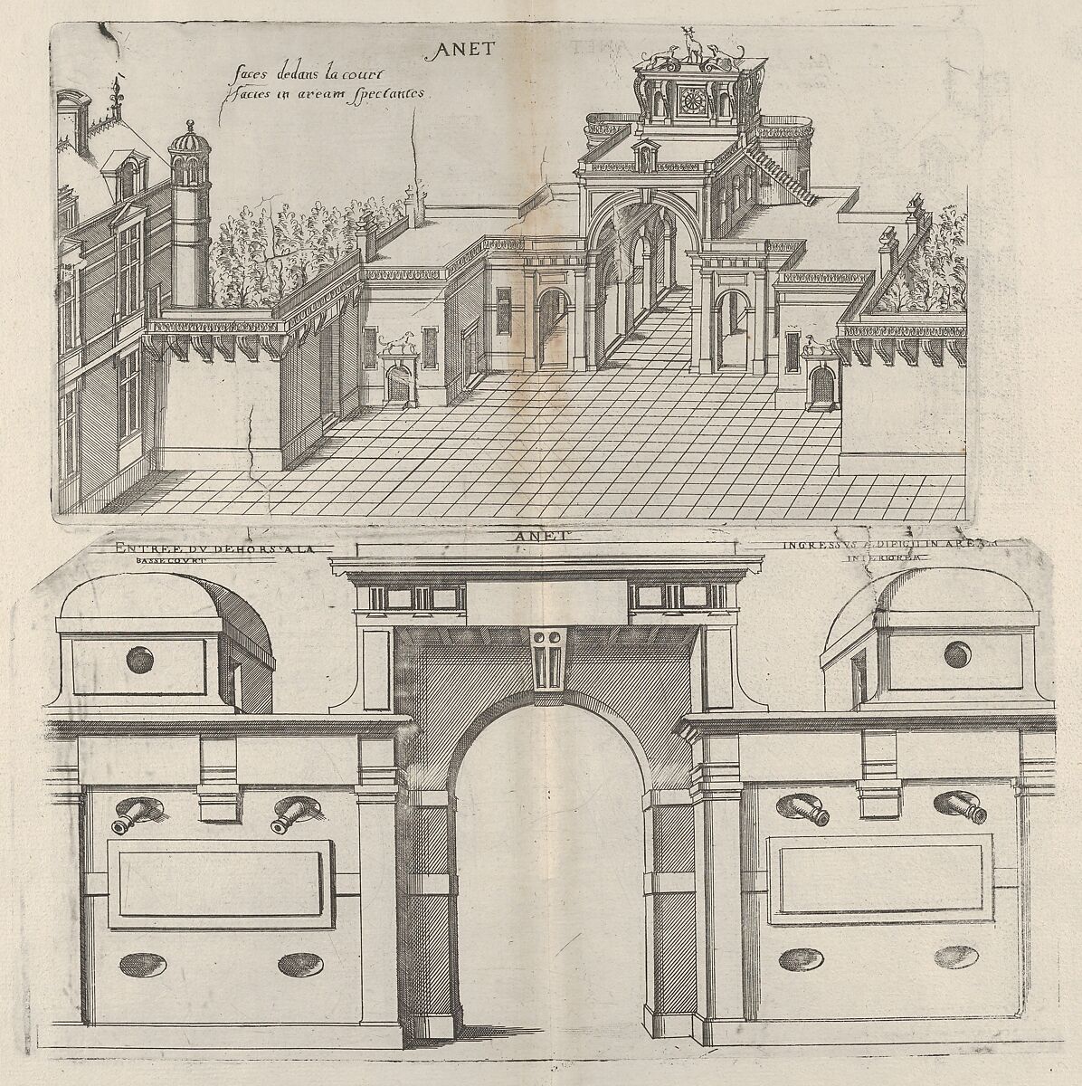 - Title: Interior View of the Court Yard and Frontal View of the Defense Mechanism at Chateau d'Anet, from "Les plus excellents bastiments de France"