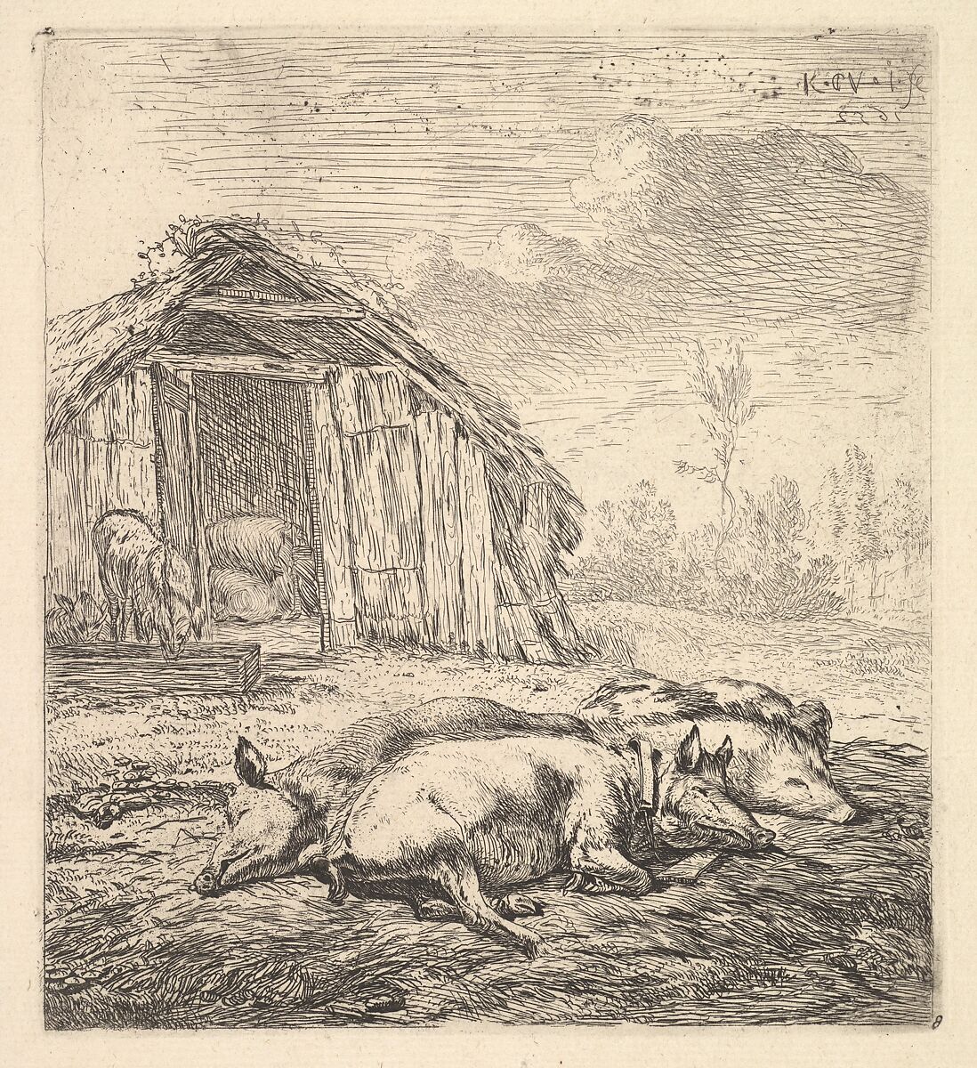 - Title: Three pigs lying on their sides, a pigsty and trough beyond
