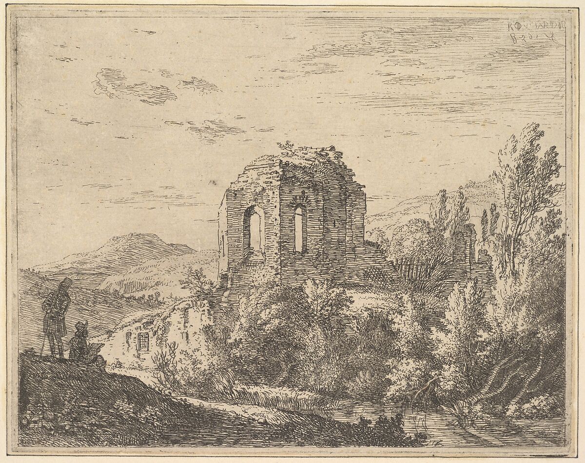 - Title: View of ruins showing the corner of a building with two arched windows, in a landscape with a stream in the foreground, from a series of four plates showing ruins of a single building