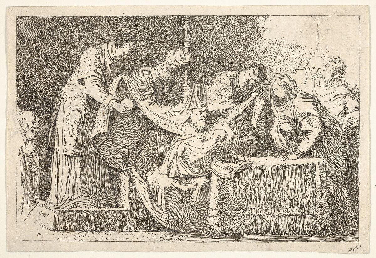 This etching is from a group of sixteen made by Fragonard in Paris around 1763-64, based on black chalk drawings he had made in Italy a few years earlier for his friend and patron, the abbé de Saint-Non. Of the sixteen, ten were based on Venetian models, including this one after Jacopo Tintoretto (Jacopo Robusti) (Italian, 1519-1594). In copying Tintoretto's painting in the Scuola Grande di San Rocco, Fragonard focused on the central scene, reducing the number of figures, suggesting a more intimate space.