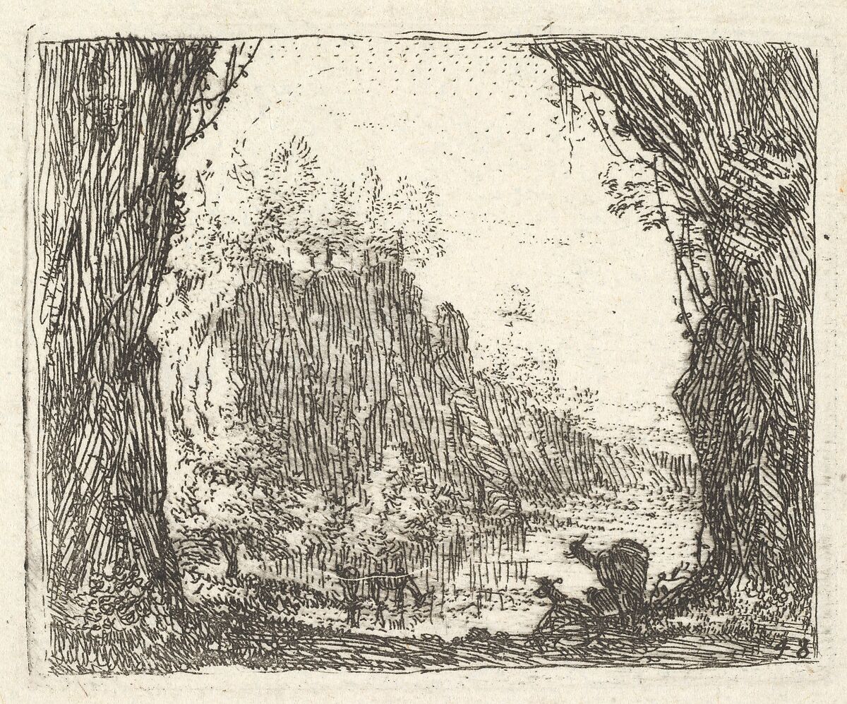 - Title: Landscape flanked by trees in the left and right foreground, silhouettes of two goats, a river with cliffs beyond, from "The Small Landscapes"