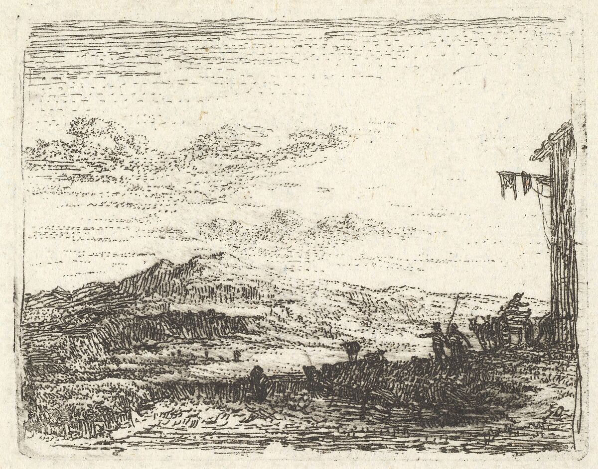 - Title: Landscape with corner of building and awning at far right, two figures and a horse-drawn cart are positioned with backs toward the building, a craggy hill beyond, from "The Small Landscapes"