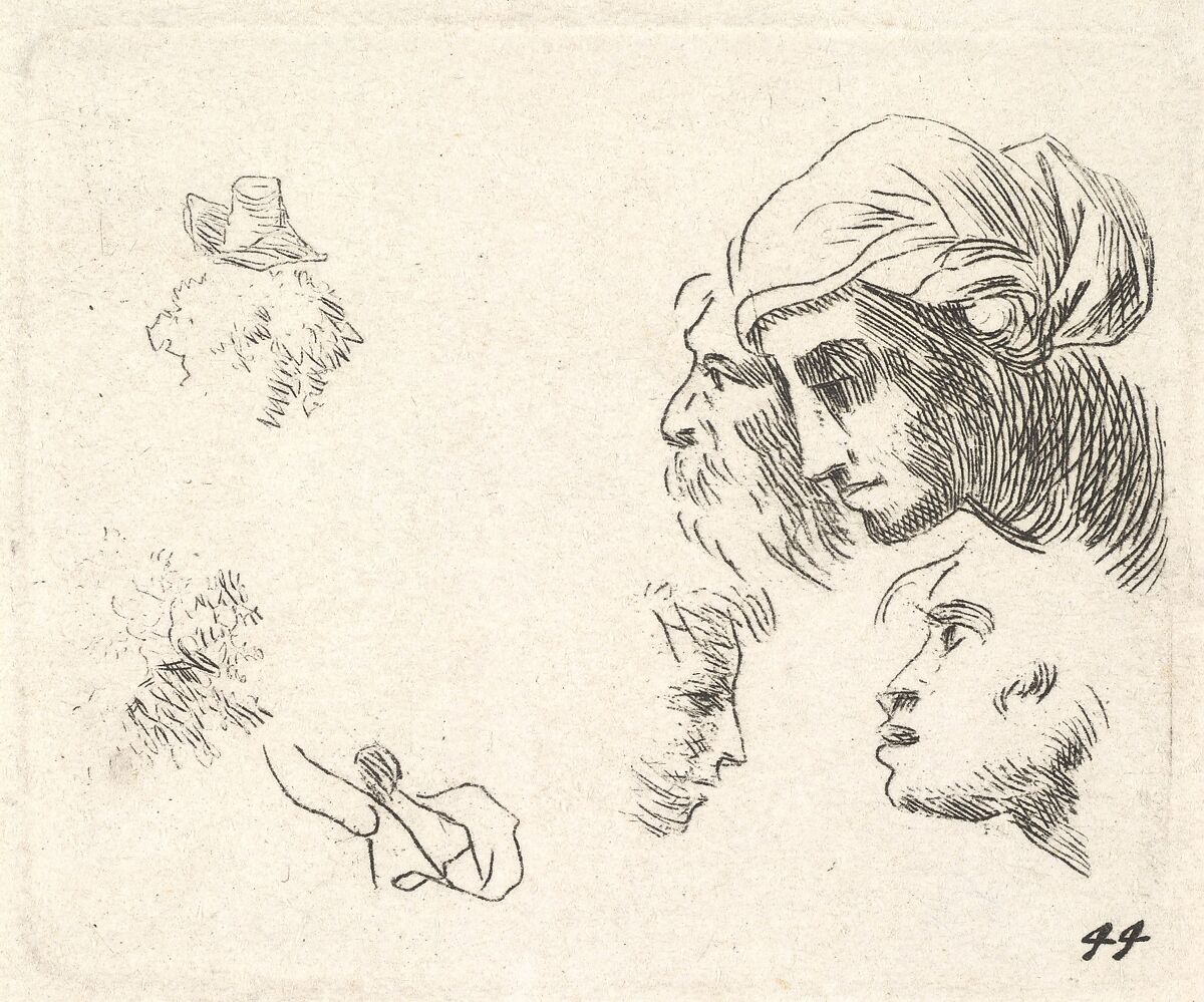 - Title: Study of heads in profile view, a woman with headcloth and bearded man whose heads overlap above, two facing profiles below