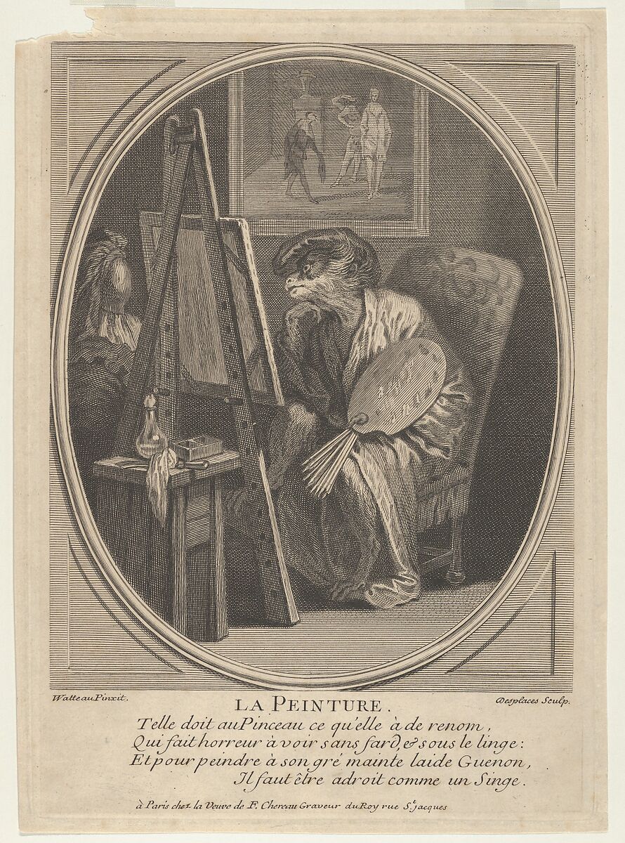 - Title: Painting (La Peinture): a monkey seated at an easel, dressed in a robe and beret and holding a painter's palette, a framed painting hanging on the wall beyond