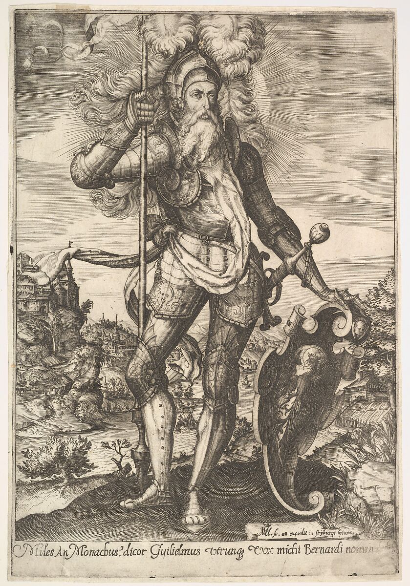 - Title: St. William of Aquitaine in armor bearing a standard in his right hand and resting his left hand on a shield, a landscape beyond
