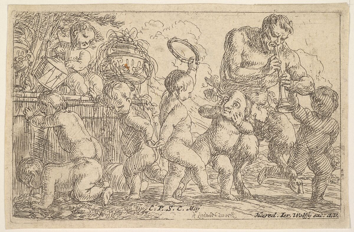 - Title: Satyr playing a pipe beside a putti holding a mask, surrounded by putti climbing over a low wall and dancing with musical instruments