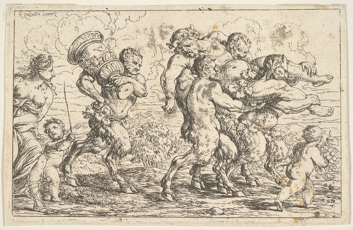 - Title: Three satyrs carrying the drunken Silenus, preceded by a putto carrying grapes; behind them a satyr carrying a large vessel, a putto, and a bare-breasted woman