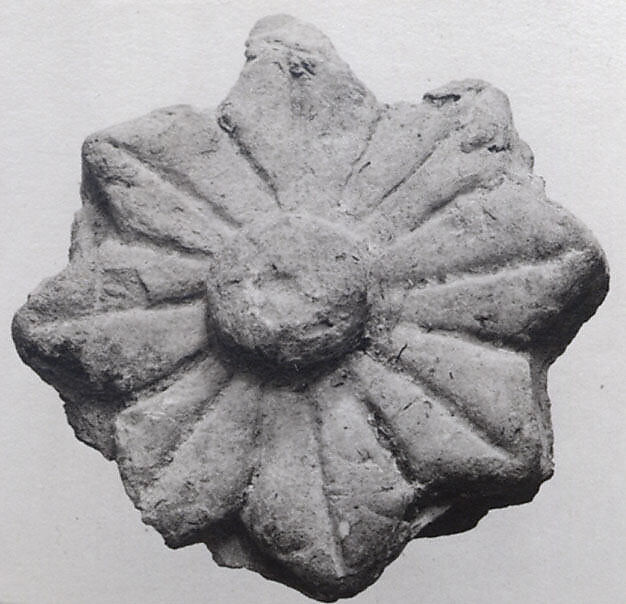 This appliqué of a floret and streamers issuing from an ornamental disk comes from the distinctive unglazed earthenware vessels found at the village of Yotkan, near the present-day oasis town of Khotan, in what is now China's Xinjiang Uygur Autonomous Region. Yotkan is the site of the ancient capital of the kingdom of Khotan, a major Buddhist center in its time and an important relay station on the southern branch of the overland Silk Road.