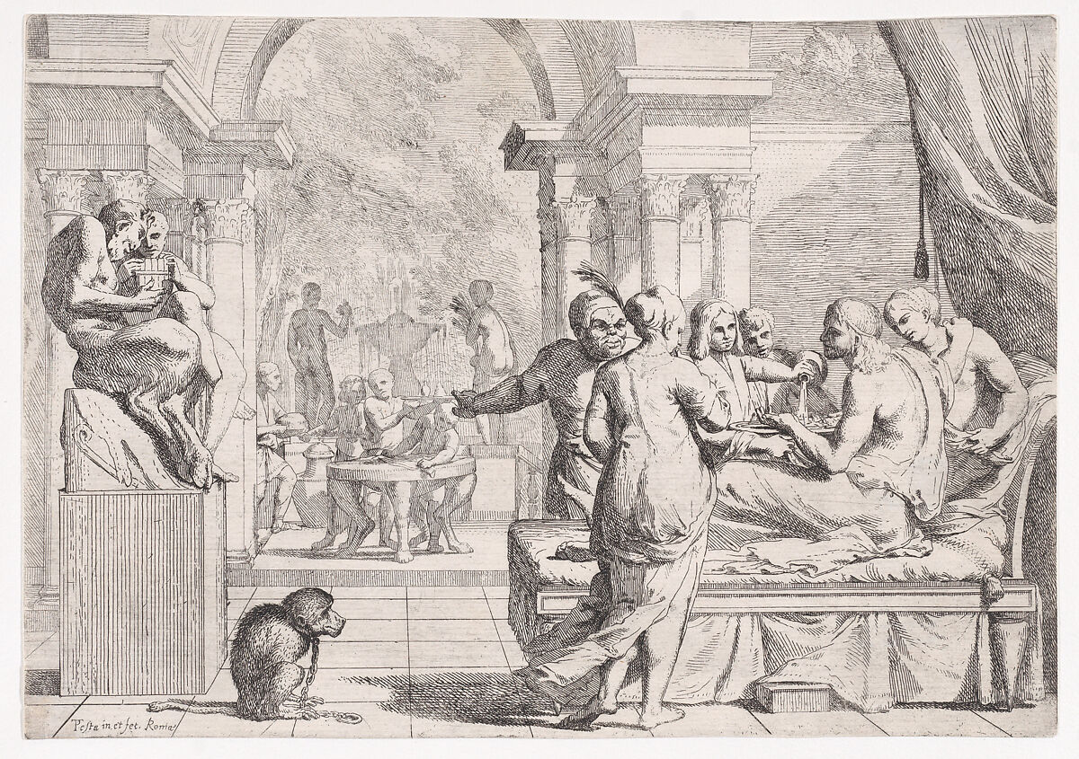 - Title: The Prodigal Son Seated on a Couch Being Served Wine, Revelers in the Background, a Monkey Wearing a Collar and Chain in the lower left