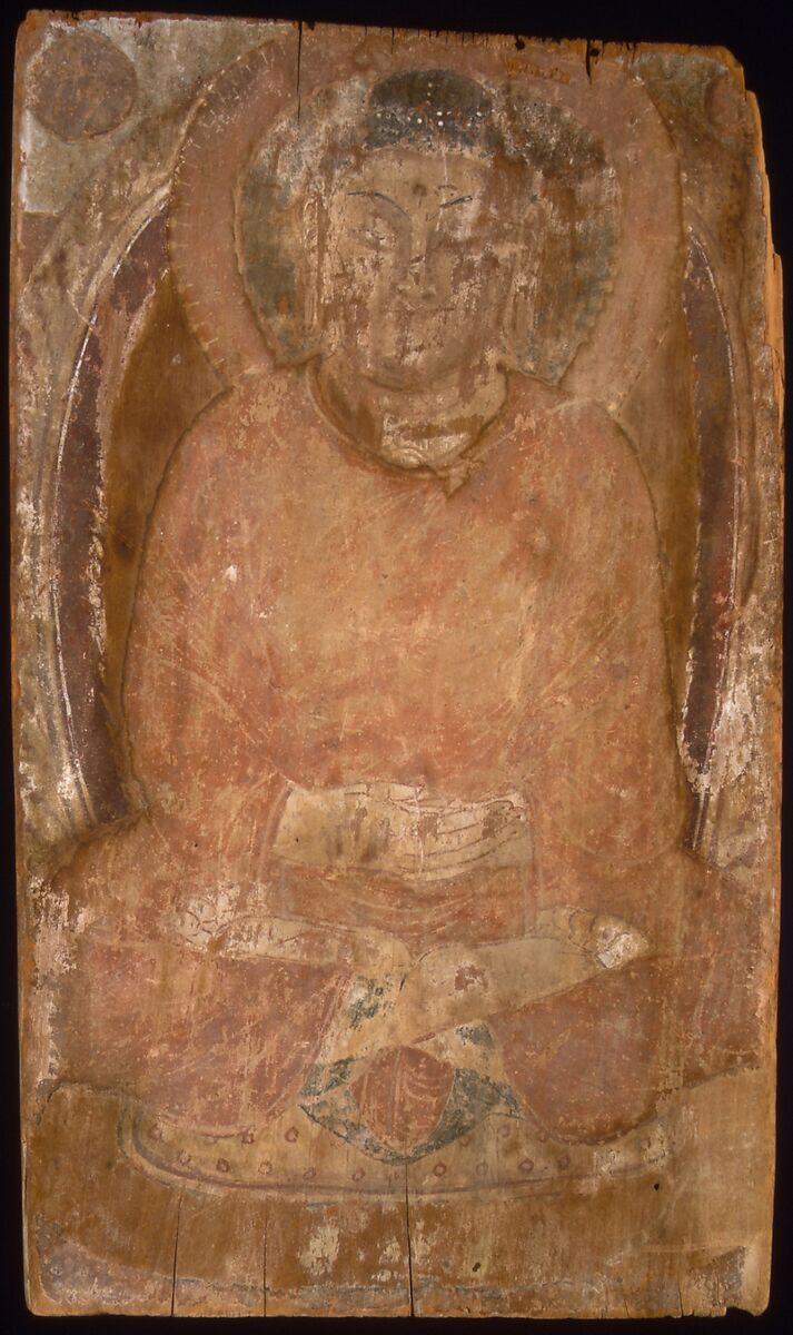 The Buddha sits in meditation, his hands in dhyana mudra. His facial type, with arched brows and light highlights, is linked to the painting style of Kizil. Most Buddhas from Dandan-Uiliq known from painting and sculpture wear red robes. A group of related votive images painted on wood panels was recovered in the Buddhist temples at Dandan-Uiliq.