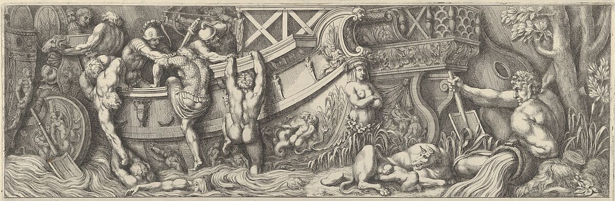 - Title: Plate 8: battle between soldiers on a boat and naked men trying to climb in, a river god at right