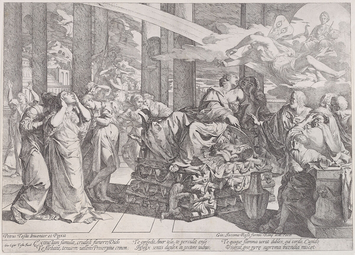 - Title: The suicide of Dido who reclines on a pyre in centre, surrounded by many figures